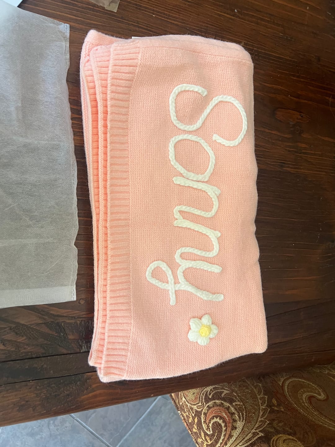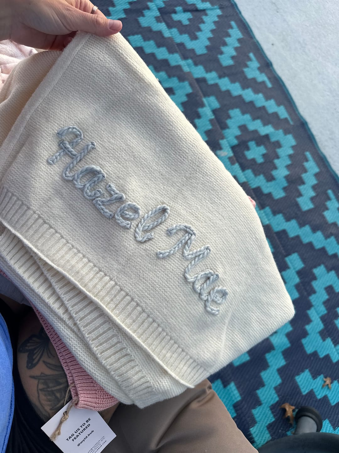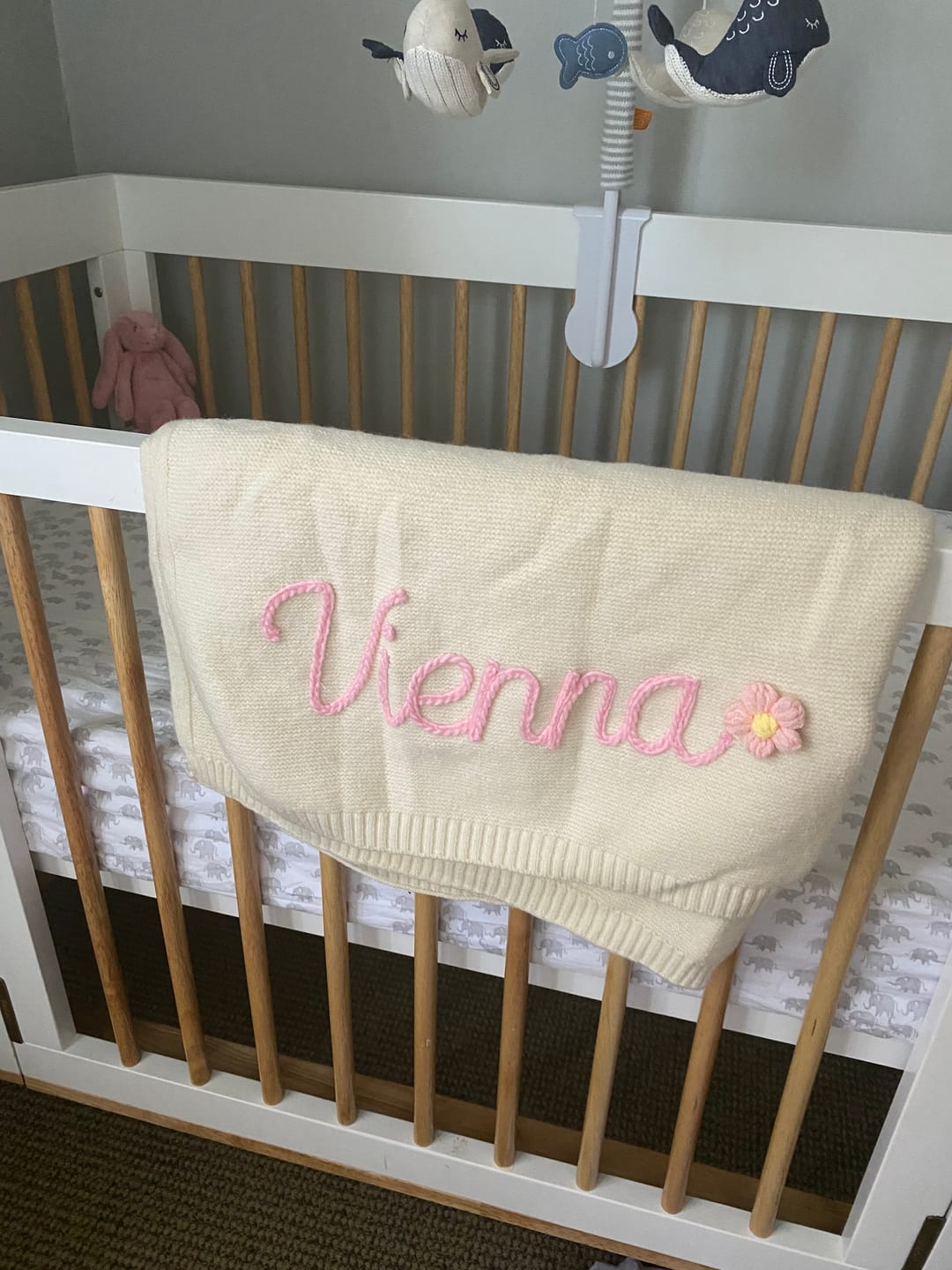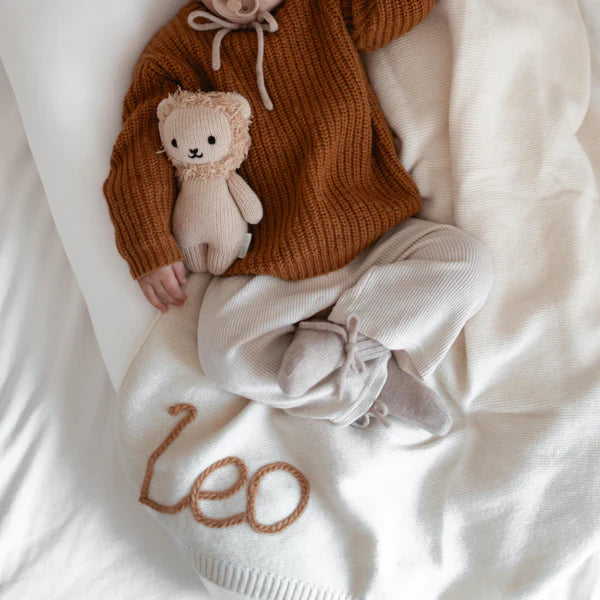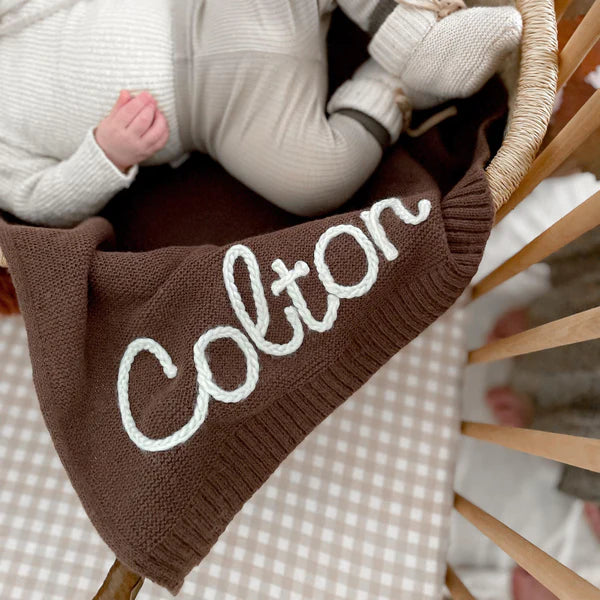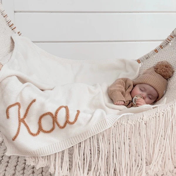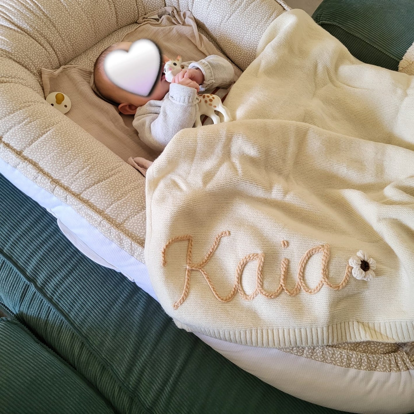 Chaque Couverture à Rêves est tricotée à la main, puis brodée avec le prénom de votre enfant pour devenir un souvenir doux et réconfortant.